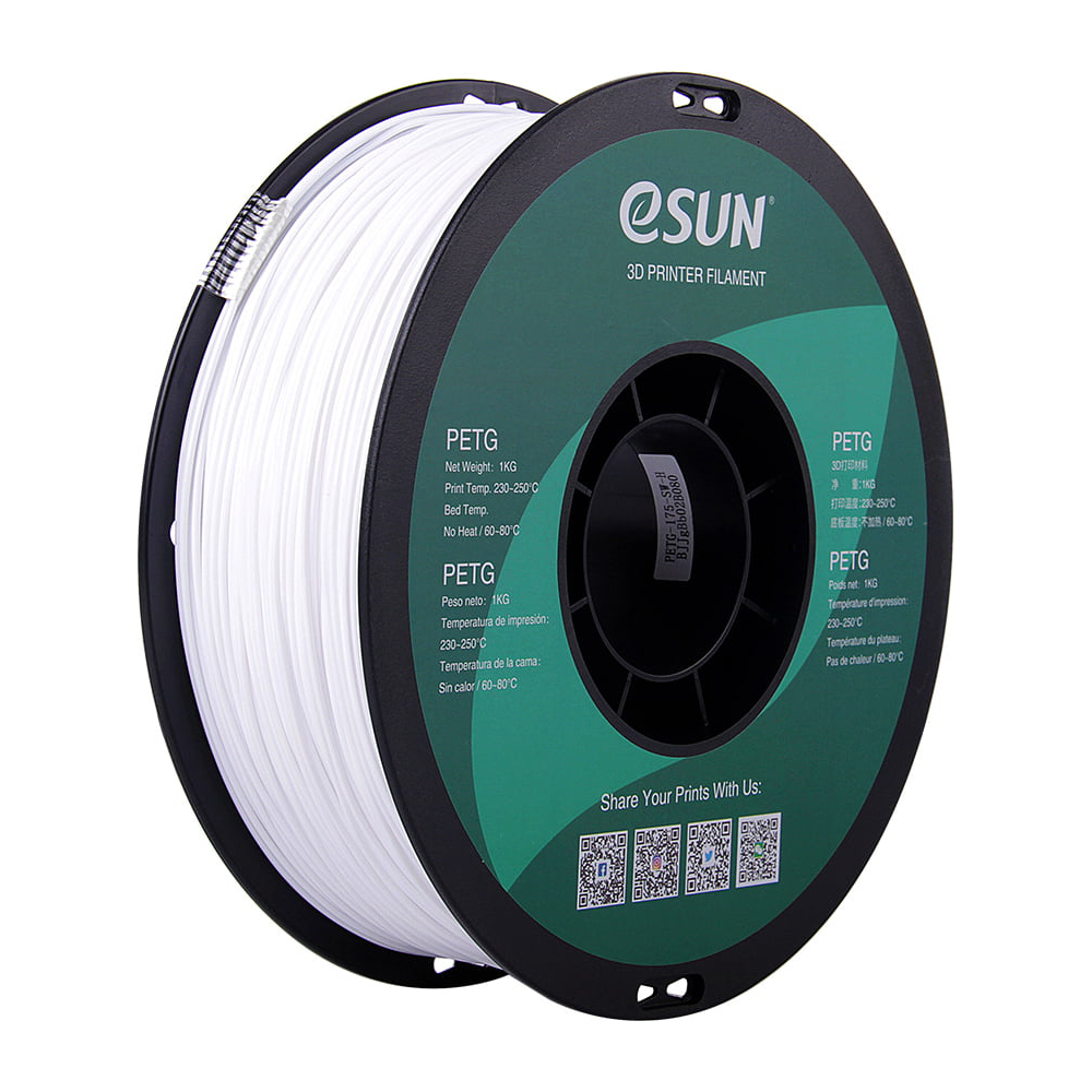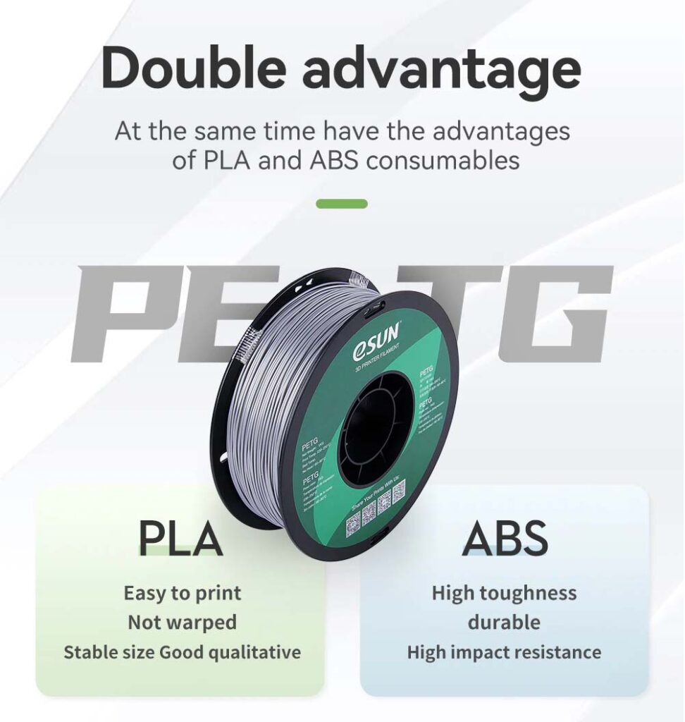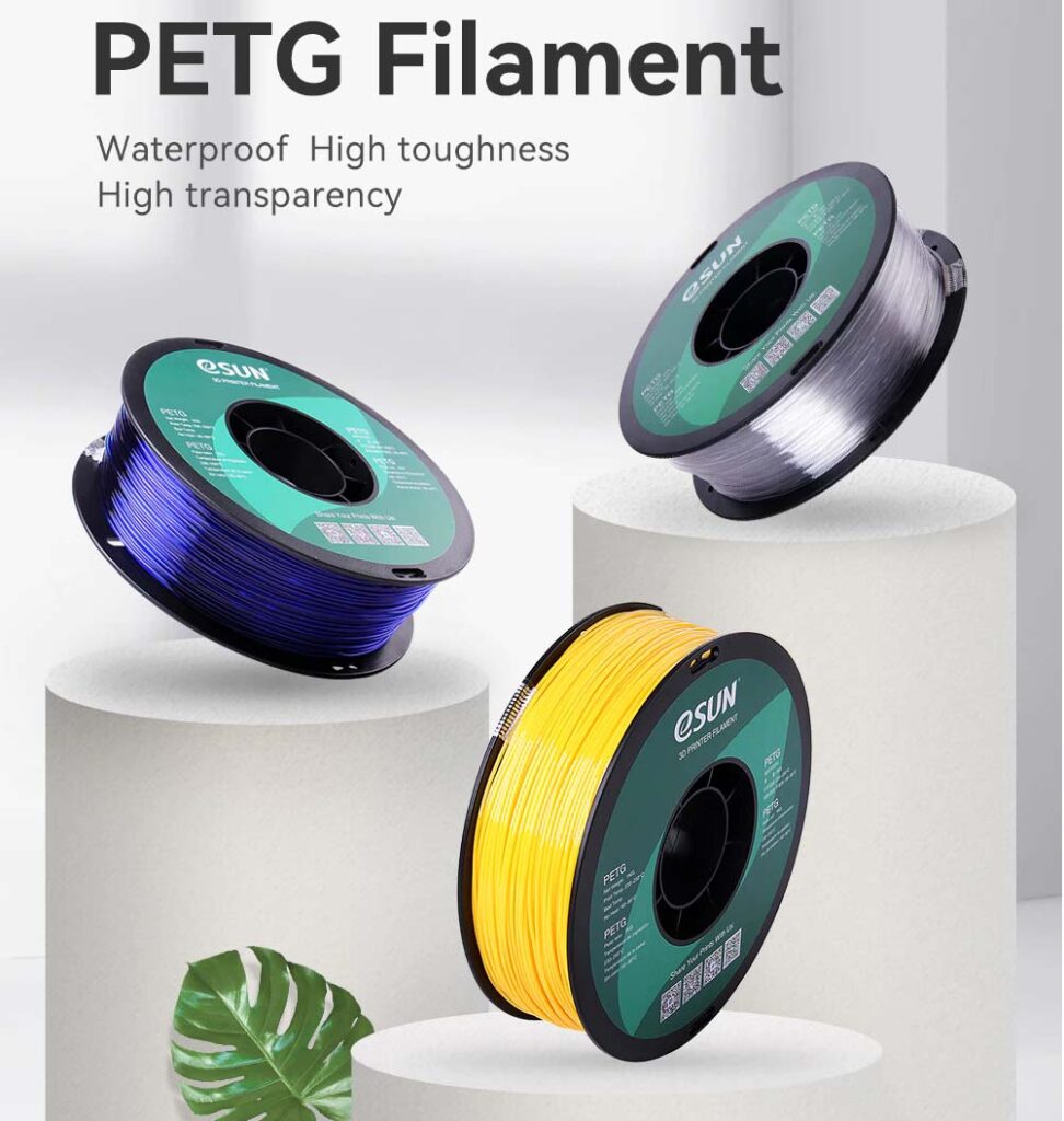 PETG je narejen iz polietilen tereftalata (PET), materiala, ki ga morda poznate iz plastičnih steklenic za vodo, vendar je nekaj etilen glikola nadomeščeno s CHDM (cikloheksandimetanol) – od tod črka »G« za PET za »glikol modificiran«. Rezultat je čistejši, manj krhek filament, ki ga je lažje iztisniti kot PET. Kljub temu je to odlična izbira filamenta za tiskanje predmetov, ki morajo biti čvrsti, gladki in imeti majhen skrček. Priljubljen je tudi zato, ker PETG velja za varnega za živila.