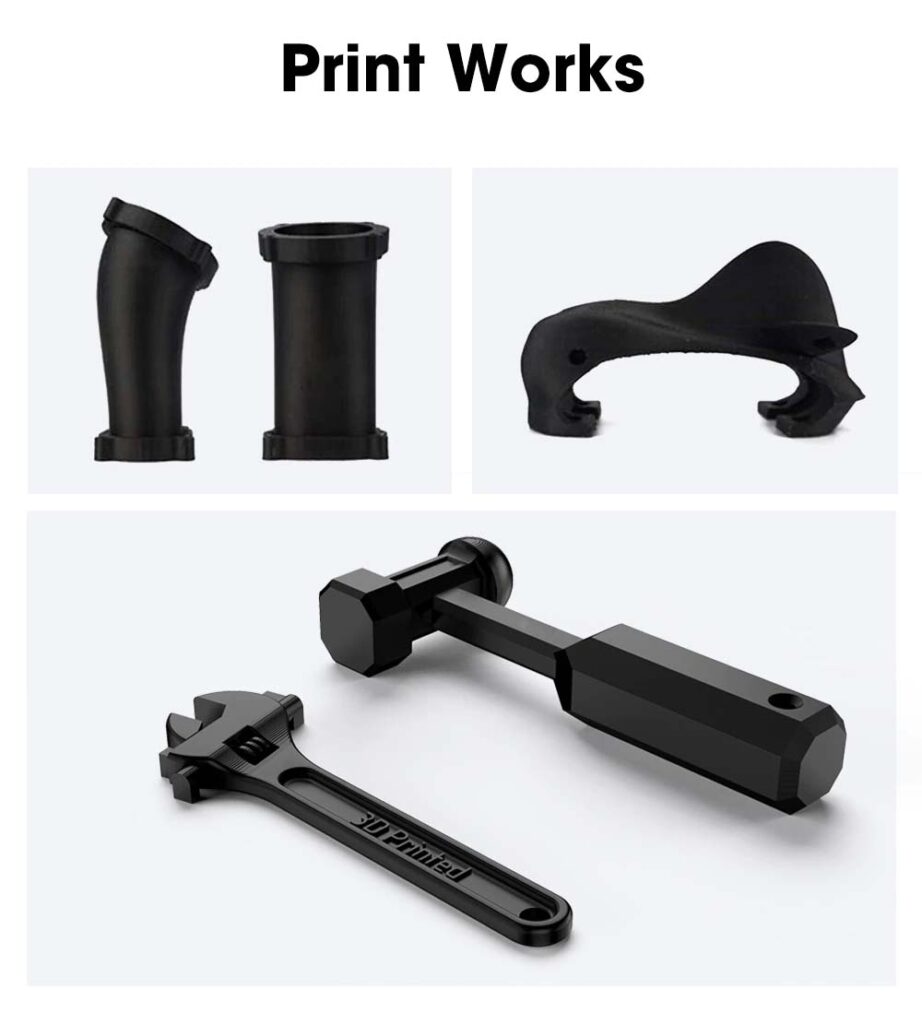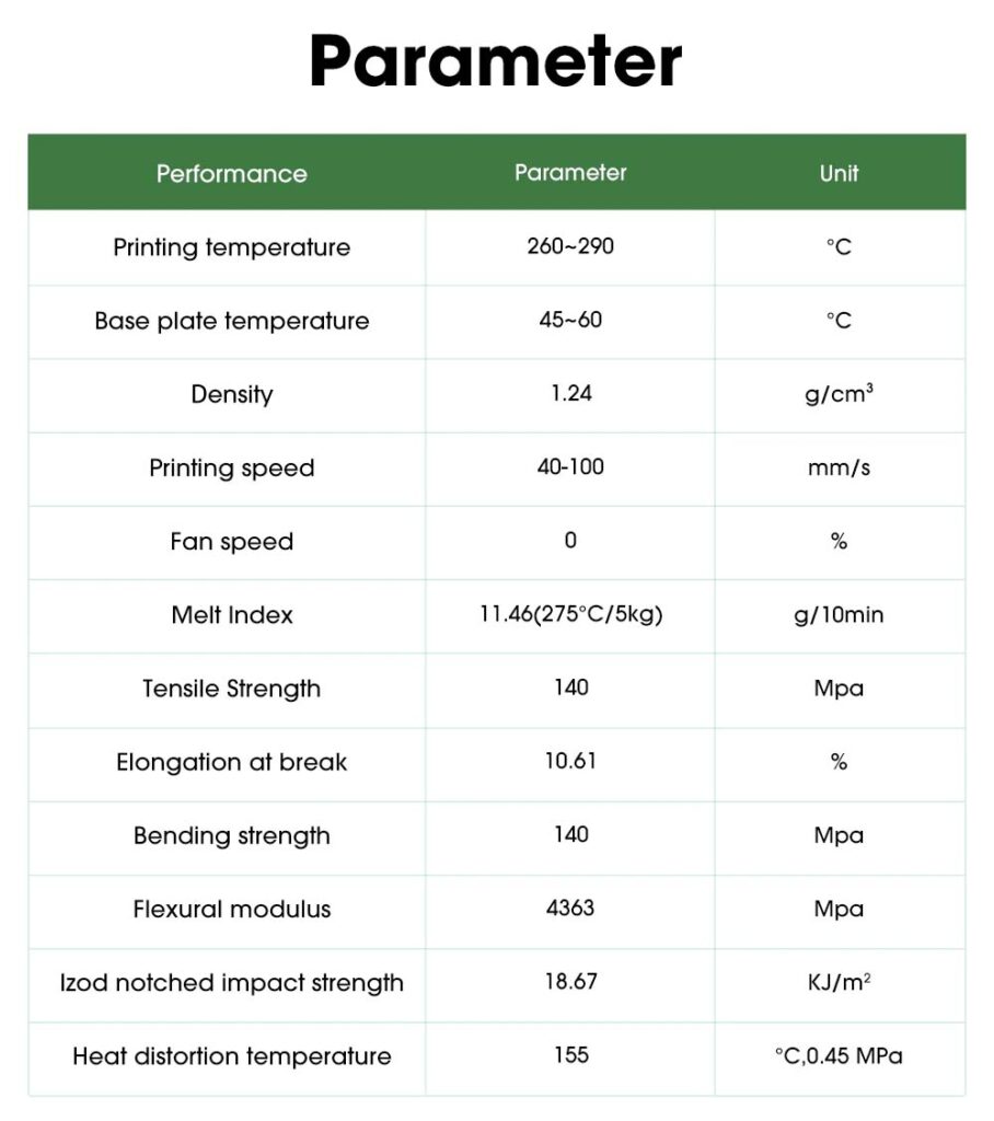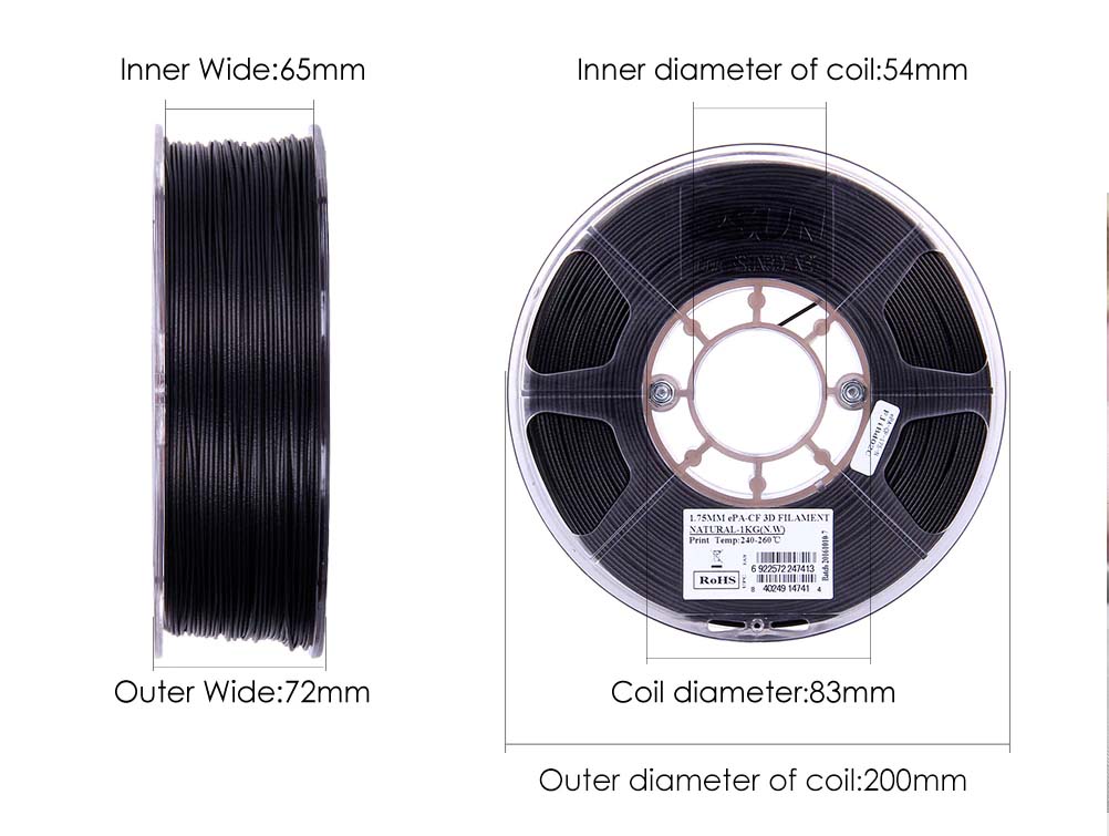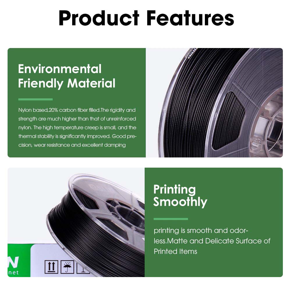 PA-CF filament je razvit na osnovi kopolimera najlona 6/66, kateremu je dodano 25% karbonskih vlaken. S tem se filamentu močno poveča trdnost, togost in žilavost, zato lahko v mnogih primerih nadomesti kovinske materiale. PA-CF je odporen na obrabo in udarce je primeren za tiskanje trpežnih delov. Odporen je tudi na visoke temperature – temperatura toplotne deformacije je nad 155 ℃. Nizek skrček – pri tiskanju ne poka in se zvija enostavno, površina natisnjenih modelov pa je mat.