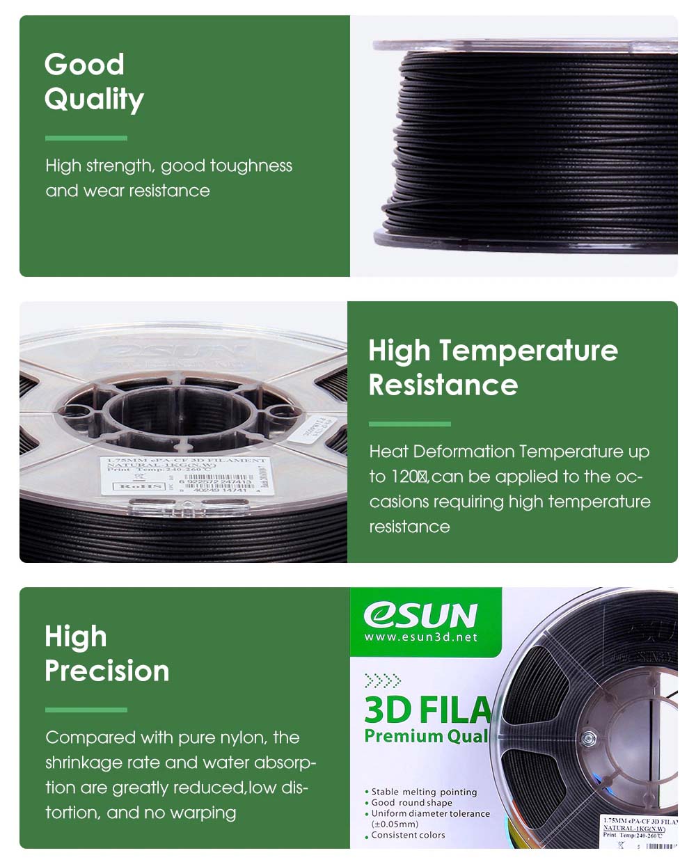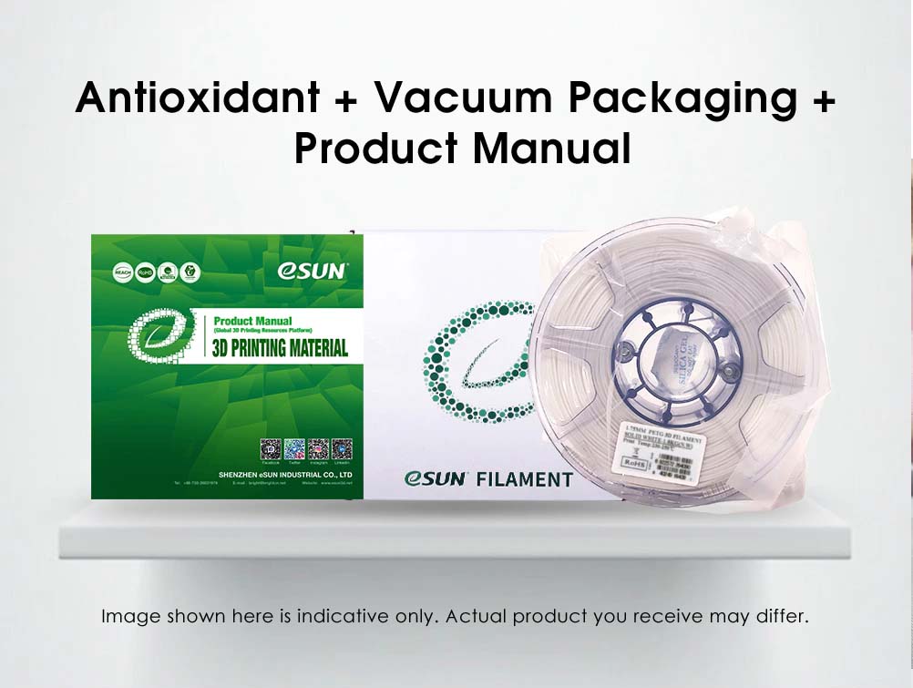 【Vakuumsko zaprta embalaža】 Neto teža: 1 kg. Filament eSUN je na voljo v zaprti vakuumski vrečki s sušilno vrečko, da ostane suh brez prahu in tujkov, kar prepreči zagozdenje šob in enakomerno ekstruzijo.